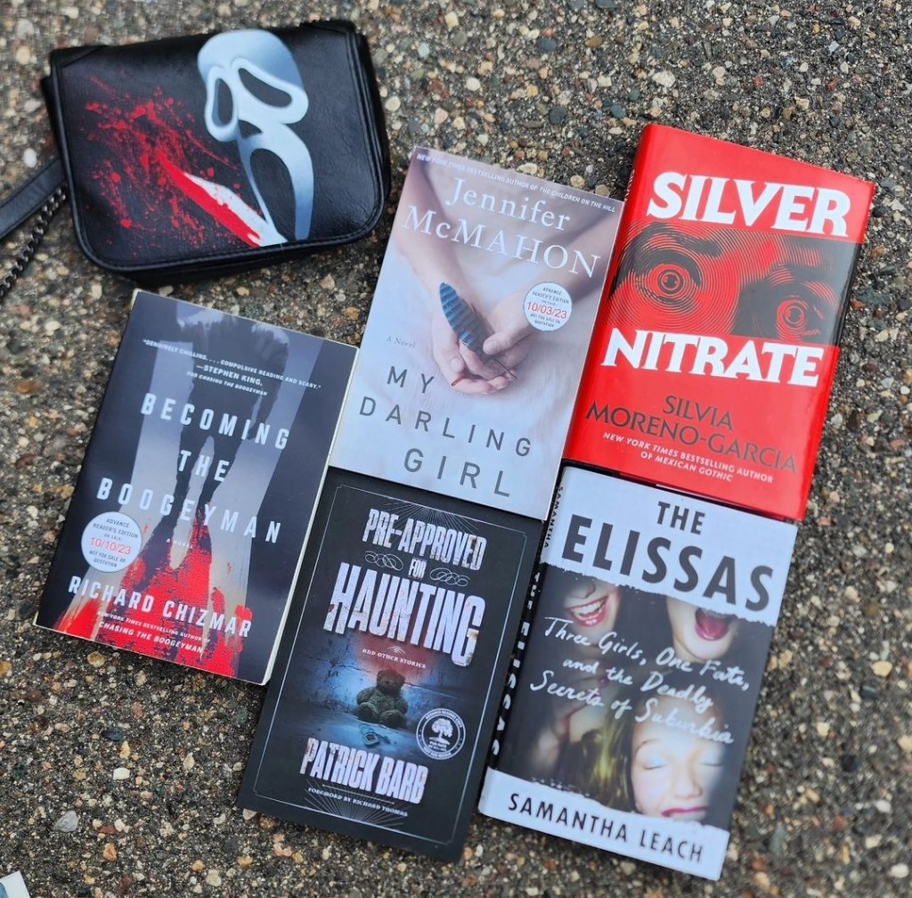 There’s just something about black, red, and white for covers that just gets me every time. This color combination is a personal favorite and it’s just an added bonus that these are spooky books I’m excited to dive into this fall! Also, can we all admire the hand-painted purse from one of my favorites, Hayley of Cup of Horrors. So talented and she understands my love of Ghostface.